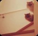 2匹のネコが階段の上にいた。顔だけ出してこちらを...